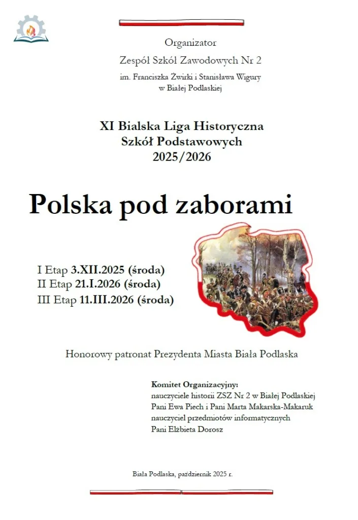 Zapraszamy w dniu 3 grudnia 2025 (środa) do Zespołu Szkół Zawodowych Nr 2 im. F. Żwirki i S. Wigury w Białej Podlaskiej na I etap XI Bialskiej Ligi Historycznej Szkół Podstawowych 2025/2026 „Polska pod zaborami”.