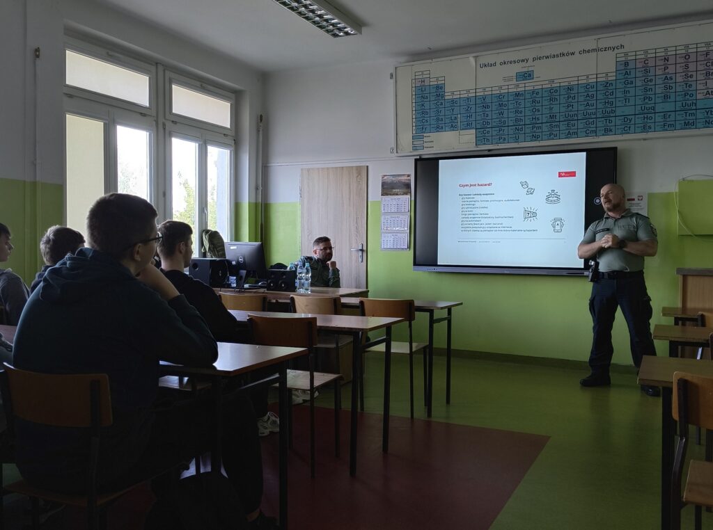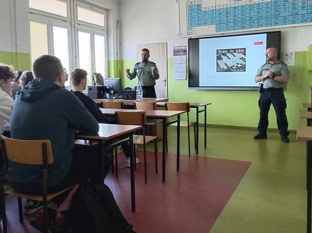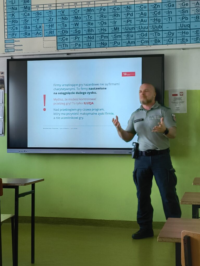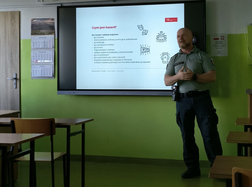 Głównym celem spotkania było podniesienie świadomości wśród osób niepełnoletnich o zagrożeniach związanych z uzależnieniem od hazardu oraz uczestnictwem w nielegalnych grach hazardowych. Spotkanie z uczniami prowadzili młodszy aspirant Mariusz Wasilczuk, podinspektor Mariusz Trochimiuk i rachmistrz Krzysztof Lik. Warto nadmienić, że Panowie sa absolwentami naszej szkoły. Trenerzy zwrócili również uwagę na problemy, które wynikają z nadmiernego korzystania przez dzieci i młodzież z gier komputerowych, takie jak uzależnienie czy wyizolowanie społeczne.