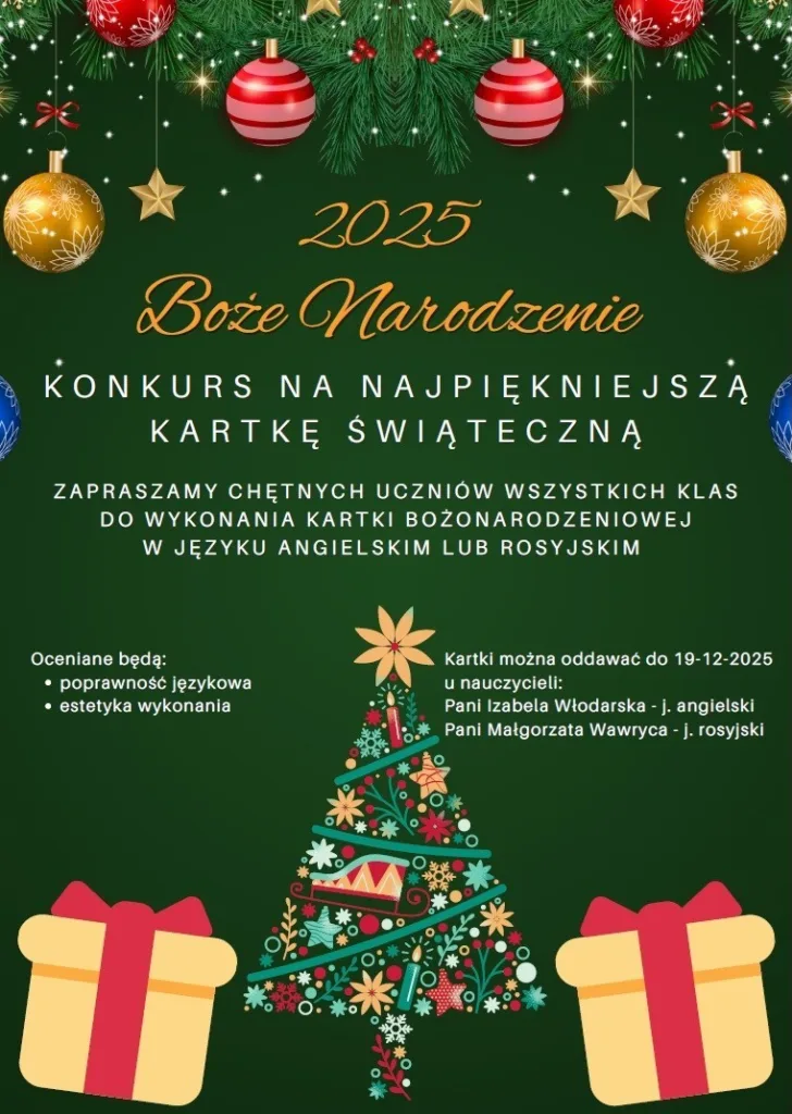 Zapraszamy chętnych uczniów wszystkich klas do wykonania kartki bożonarodzeniowej w języku angielskim lub rosyjskim.