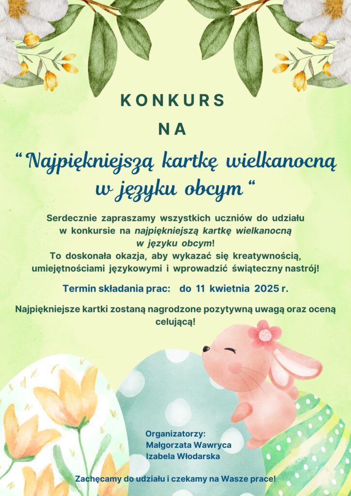 Strona główna Aktualności Konkurs na „Najpiękniejszą kartkę wielkanocną w języku obcym” Konkurs na „Najpiękniejszą kartkę wielkanocną w języku obcym”Ewa Toczek27.03.2025