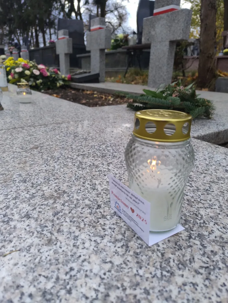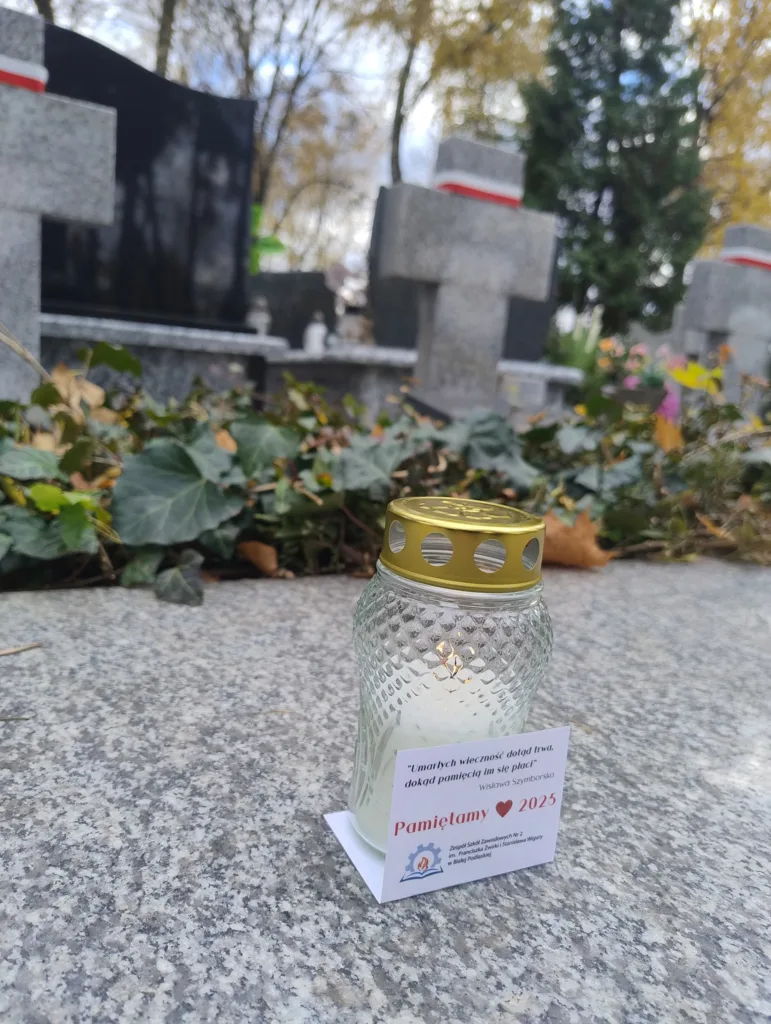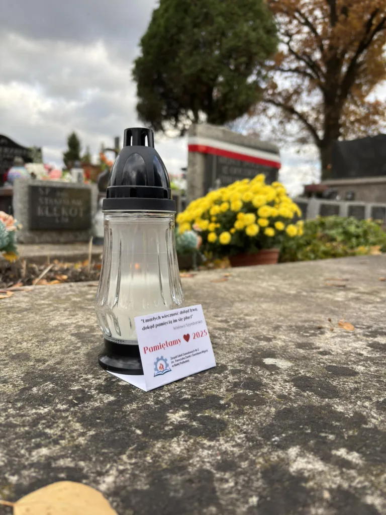 Znicze, które pozyskane były w ramach szkolnego działania SKW ZSZ nr 2 Biała Podlaska „Akcja Znicz PAMIĘTAMY” oznaczone zostały specjalnie przygotowanymi karteczkami z cytatem: