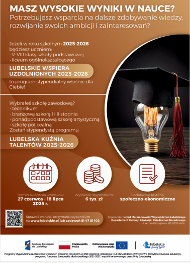 W roku szkolnym 2025 – 2026 uczniowie wszystkich klas technikum i szkoły branżowej, w tym uczniowie klas pierwszych, mogą ubiegać się o stypendium z programu „Lubelska kuźnia talentów 2025-2026” w kwocie 750 zł / miesiąc, wypłacane przez 8 miesięcy, czyli w roku szkolnym będzie to 6 000 zł.