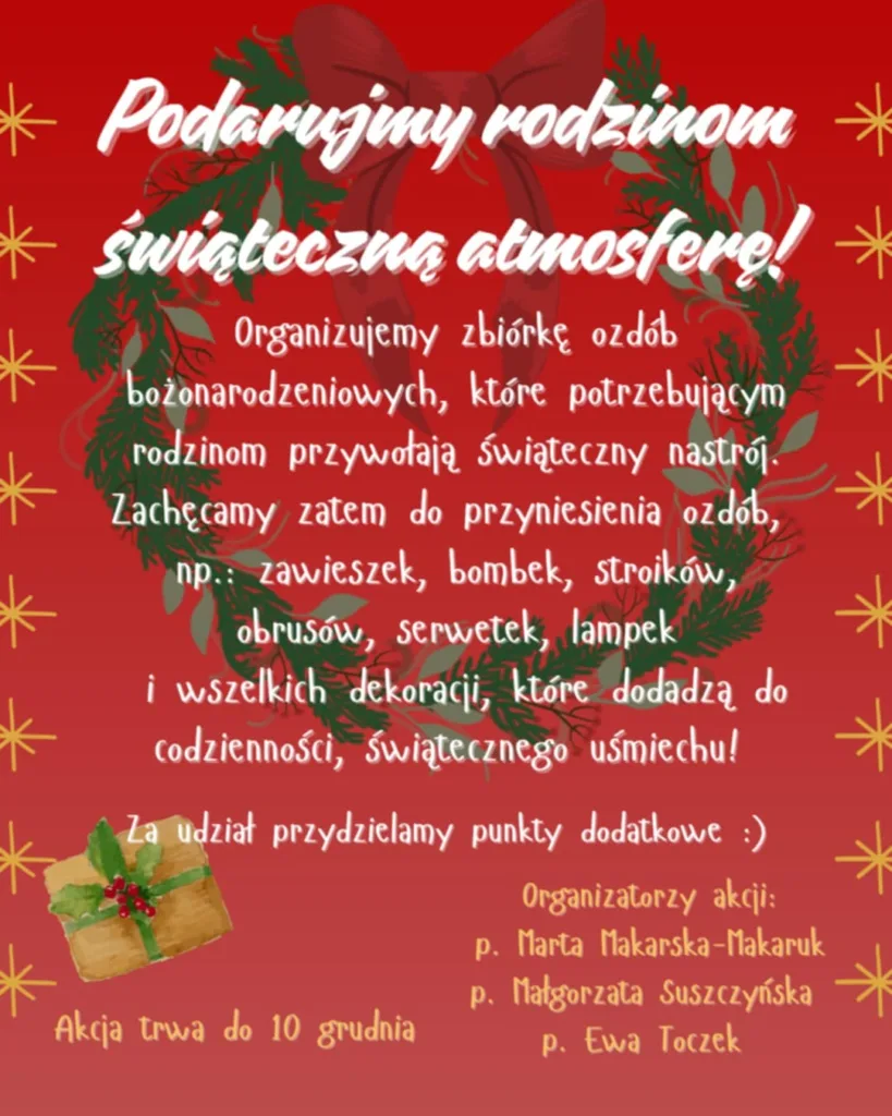 Zachęcamy zatem do przyniesienia ozdób np.: zawieszek, bombek, stroików, obrusów, serwetek, lampek i wszelkich dekoracji, które dodadzą codzienności, świątecznego uśmiechu.