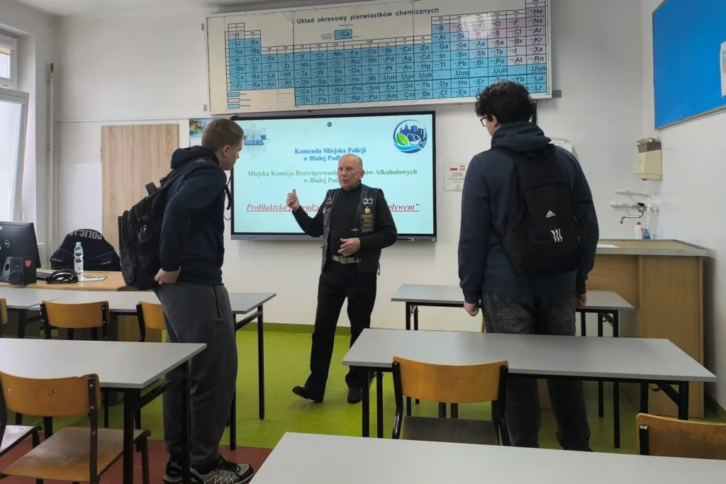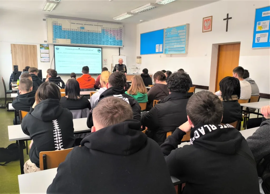 Uczniowie klas technikum 4 BTU, 4 TE, 4 TG, 4 TIM, 4 TS oraz 3 S szkoły branżowej I stopnia wzięli udział w spotkaniu profilaktycznym z funkcjonariuszami Policji z Zespołu ds. Profilaktyki Społecznej, Nieletnich i Patologii – st. asp. Sylwią Jaworowską oraz sierż. szt. Piotrem Waszczukiem. W spotkaniu uczestniczył także przedstawiciel Miejskiej Komisji Rozwiązywania Problemów Alkoholowych w Białej Podlaskiej – pan Zdzisław Kozłowski.