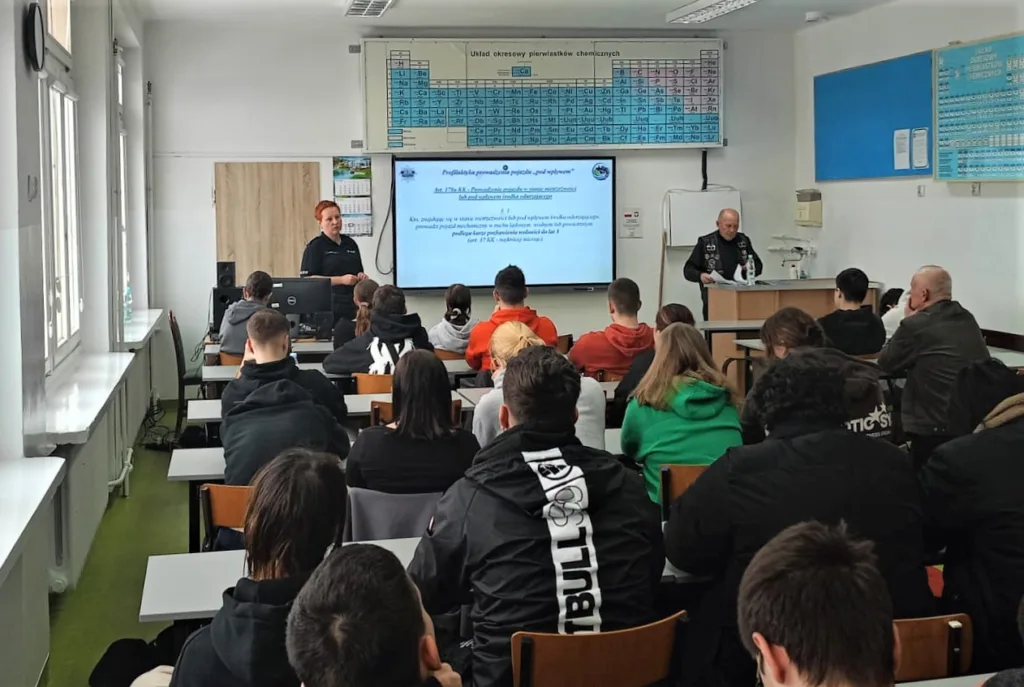 Tematem prelekcji była profilaktyka dotycząca prowadzenia pojazdów pod wpływem alkoholu i innych środków odurzających. Policjanci omówili zagrożenia wynikające z takich zachowań, a także konsekwencje prawne i społeczne. Przedstawiono również dane dotyczące bezpieczeństwa w ruchu drogowym oraz najczęstsze przyczyny wypadków i kolizji.