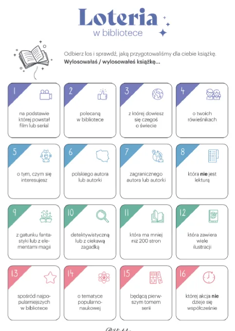 Zasady loterii są proste. Wystarczy przyjść do biblioteki szkolnej i wylosować karteczkę z numerem, pod którym ukryta jest kategoria książki.