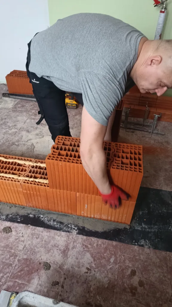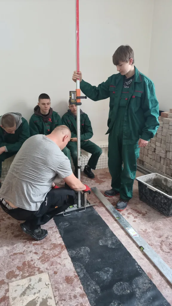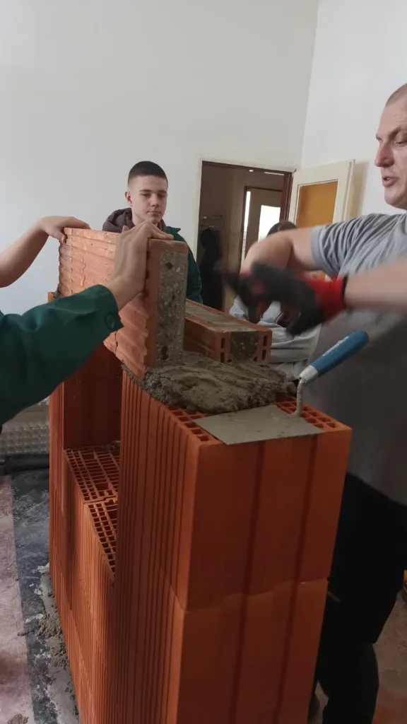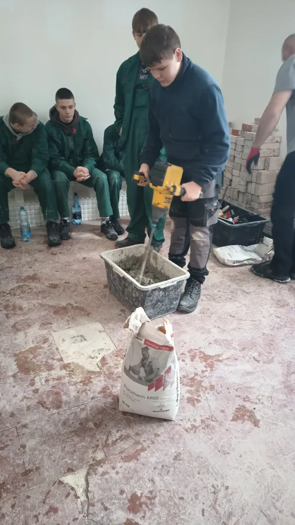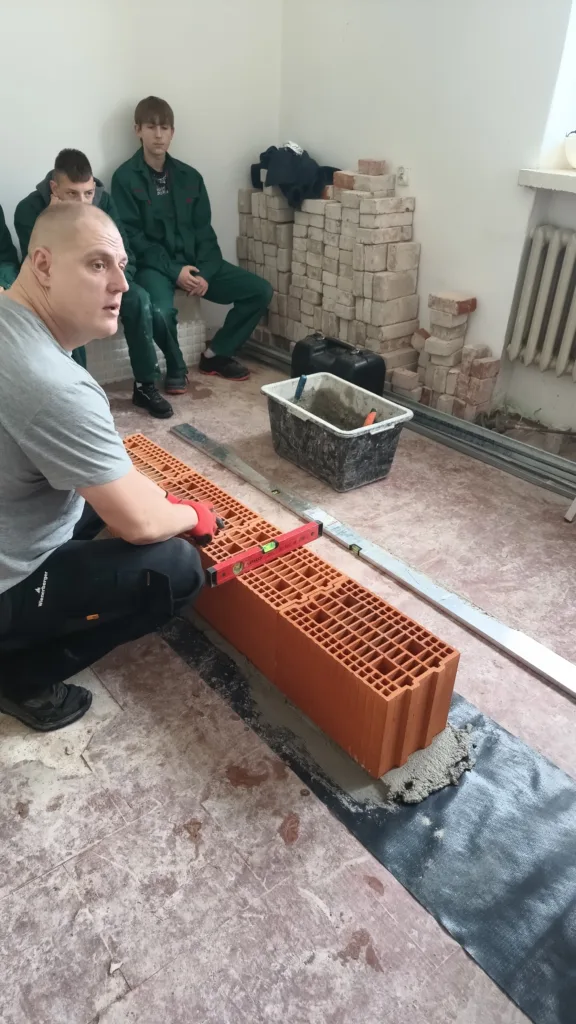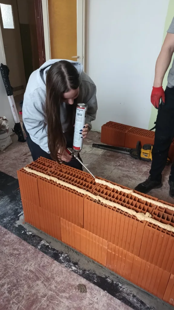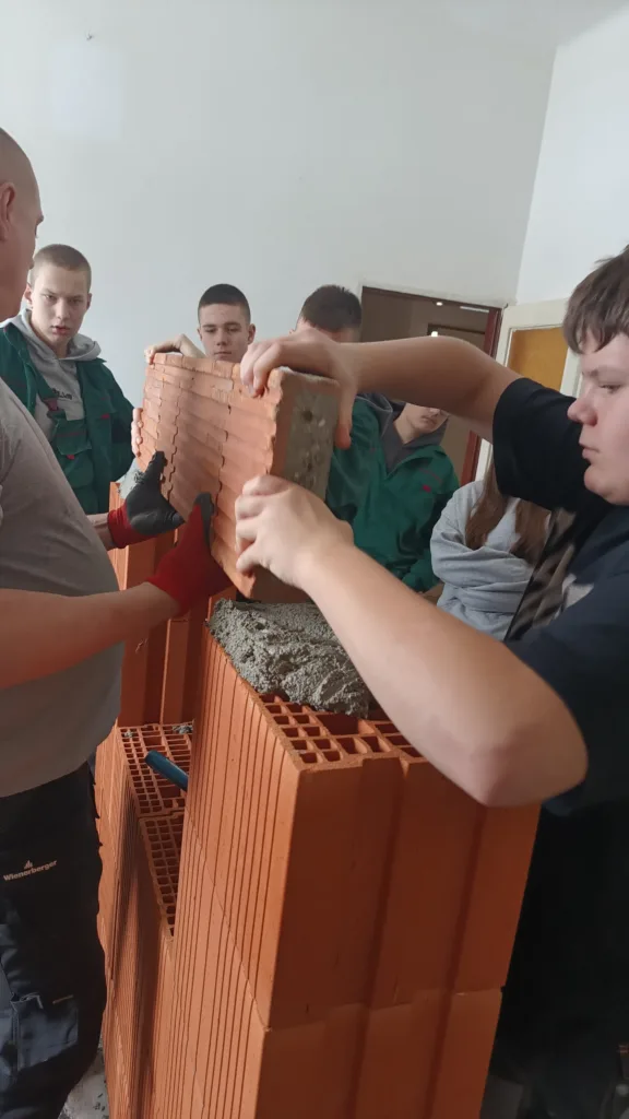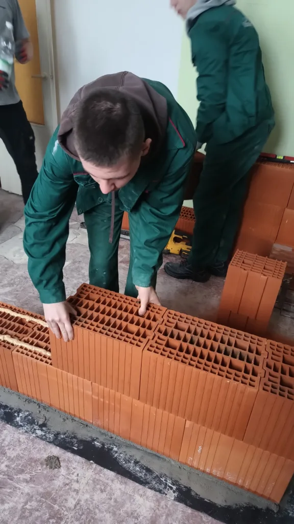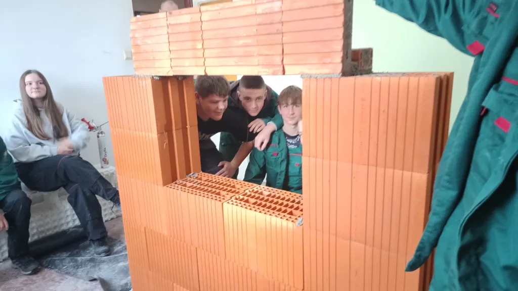 Technicy budownictwa z pierwszej klasy z Zespołu Szkół Zawodowych Nr 2 im. F. Żwirki i S. Wigury z Białej Podlaskiej w dniu 24 listopada 2025 pod czujnym okiem przedstawiciela firmy Wienerberger ćwiczyli technologię budowy z pustaków ceramicznych Porotherm 25 Dryfix. Po ułożeniu izolacji poziomej, wykonaniu poziomowania ze zwykłej zaprawy z przyjemnością układamy bardzo dokładnie wyszlifowane pustaki na ekstremalnie mocną piankę szybko dokładnie bez łopaty i betoniarki – tak się buduje w XXI wieku.