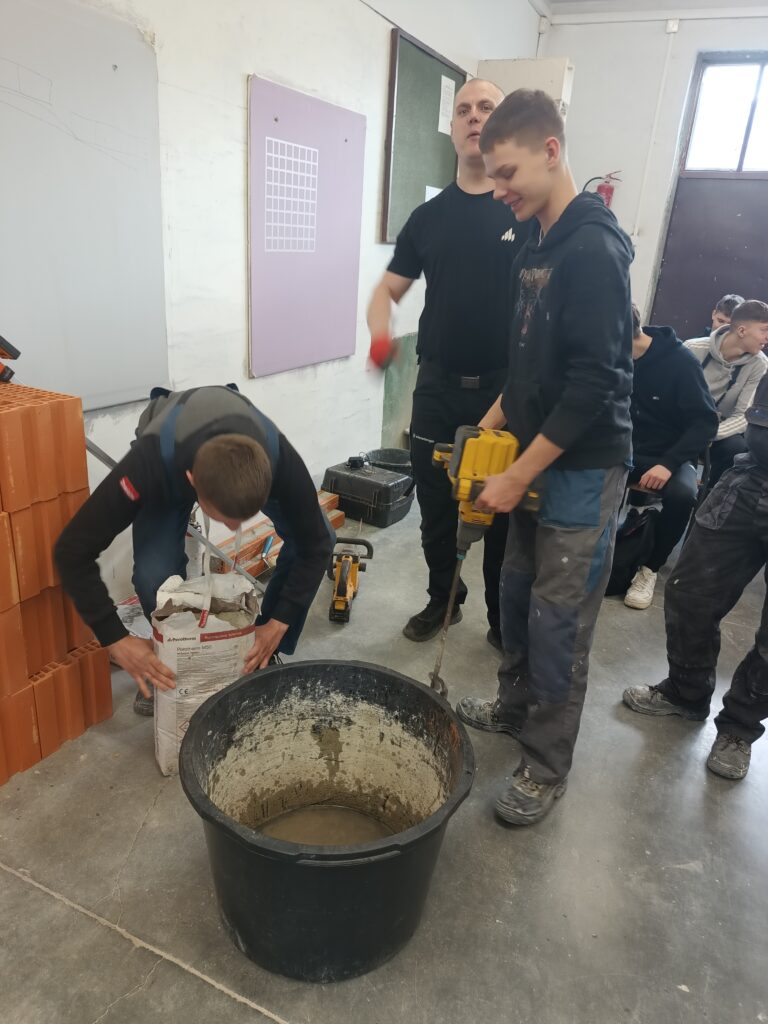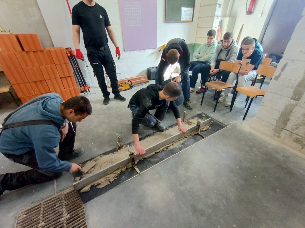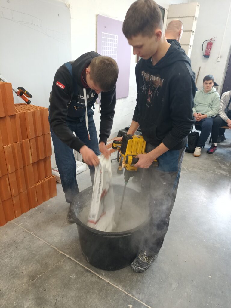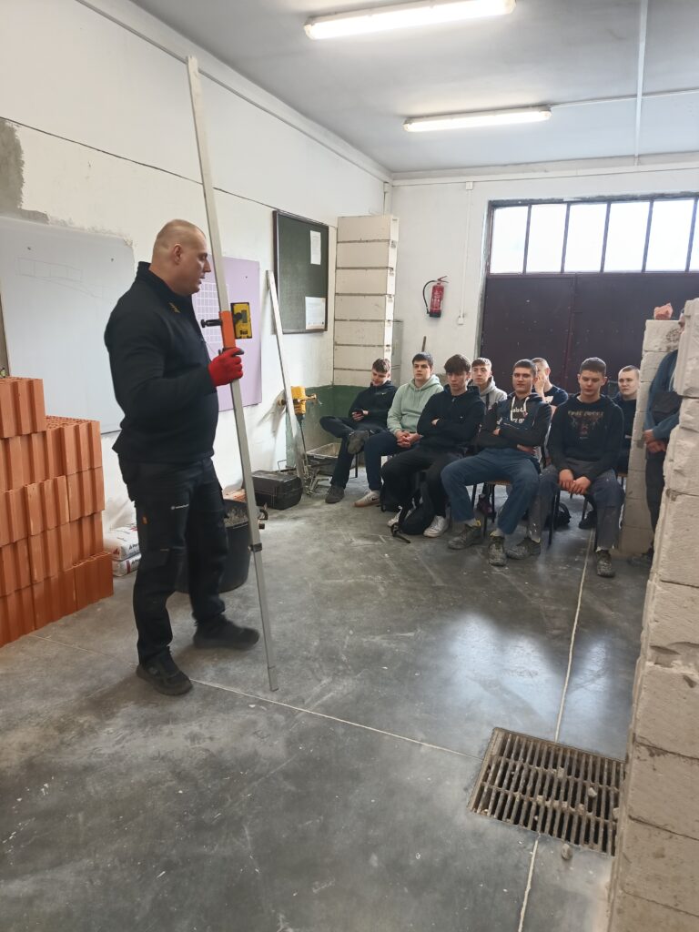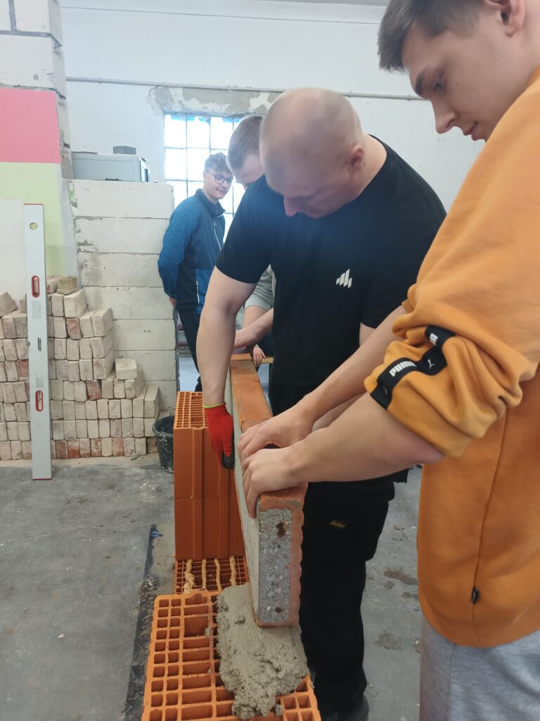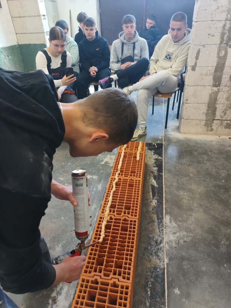 Technicy budownictwa z Zespołu Szkół Zawodowych Nr 2 im. F. Żwirki i S. Wigury z Białej Podlaskiej pod czujnym okiem przedstawiciela firmy Wienerberger ćwiczyli technologię budowy z pustaków ceramicznych Porotherm 25 Dryfix. Po ułożeniu izolacji poziomej, wykonaniu poziomowania ze zwykłej zaprawy z przyjemnością układamy bardzo dokładnie wyszlifowane pustaki na ekstremalnie mocną piankę szybko dokładnie bez łopaty i betoniarki – tak się buduje w XXI wieku.