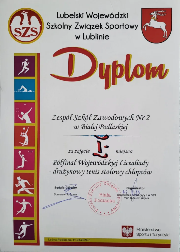 11 lutego 2026 r. w Leśnej Podlaskiej odbył się Półfinał Wojewódzki Licealiady w Drużynowym Tenisie Stołowym Chłopców.