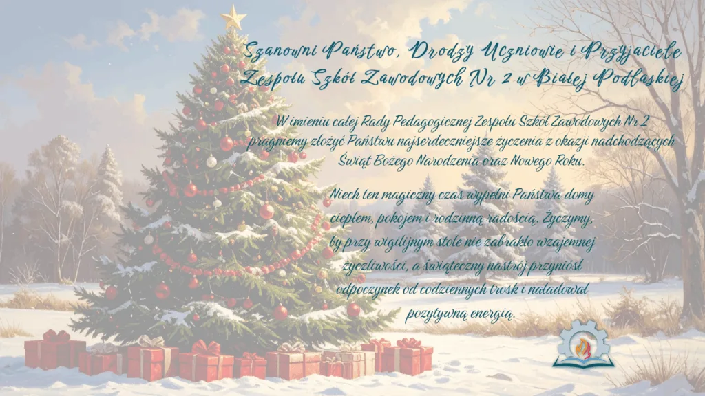 W imieniu całej Rady Pedagogicznej Zespołu Szkół Zawodowych Nr 2 pragniemy złożyć Państwu najserdeczniejsze życzenia z okazji nadchodzących Świąt Bożego Narodzenia oraz Nowego Roku.