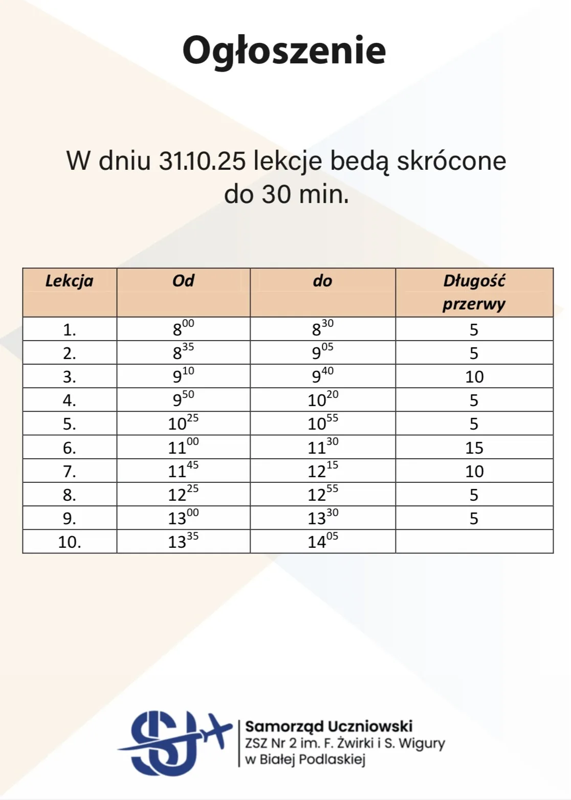 Na wniosek Samorządu Uczniowskiego zajęcia w dniu 31 października...